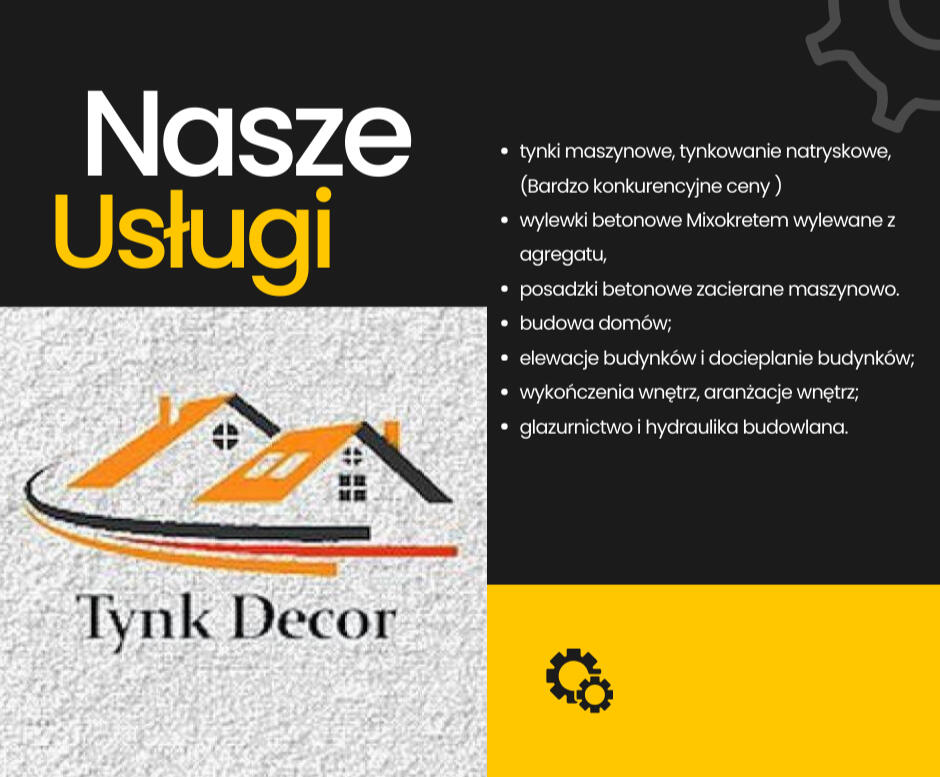 Tynki maszynowe i natryskowe: Oferujemy wysokiej jakości tynki maszynowe oraz tynkowanie natryskowe w bardzo konkurencyjnych cenach. Dzięki nowoczesnemu podejściu i doświadczeniu zapewniamy wykończenie najwyższej jakości.Wylewki betonowe Mixokretem: Specjalizujemy się w wykonywaniu wylewek betonowych Mixokretem, zapewniamy precyzyjne wykonanie i trwałość.Posadzki betonowe: Nasze posadzki betonowe są wykonywane z dbałością o każdy szczegół, zacierane maszynowo dla perfekcyjnego wykończenia.Budowa domów: Oferujemy kompleksowe usługi budowy domów od fundamentów po dach, zwracając uwagę na każdy etap budowy, aby zapewnić Państwu dom marzeń.Elewacje budynków i docieplanie: Dzięki naszej wiedzy i doświadczeniu możemy zmodernizować elewacje budynków oraz przeprowadzić docieplenie, poprawiając wygląd i efektywność energetyczną.Wykończenia wnętrz i aranżacje: Specjalizujemy się w wykończeniach wnętrz i aranżacjach, dbając o estetykę i funkcjonalność każdego projektu.